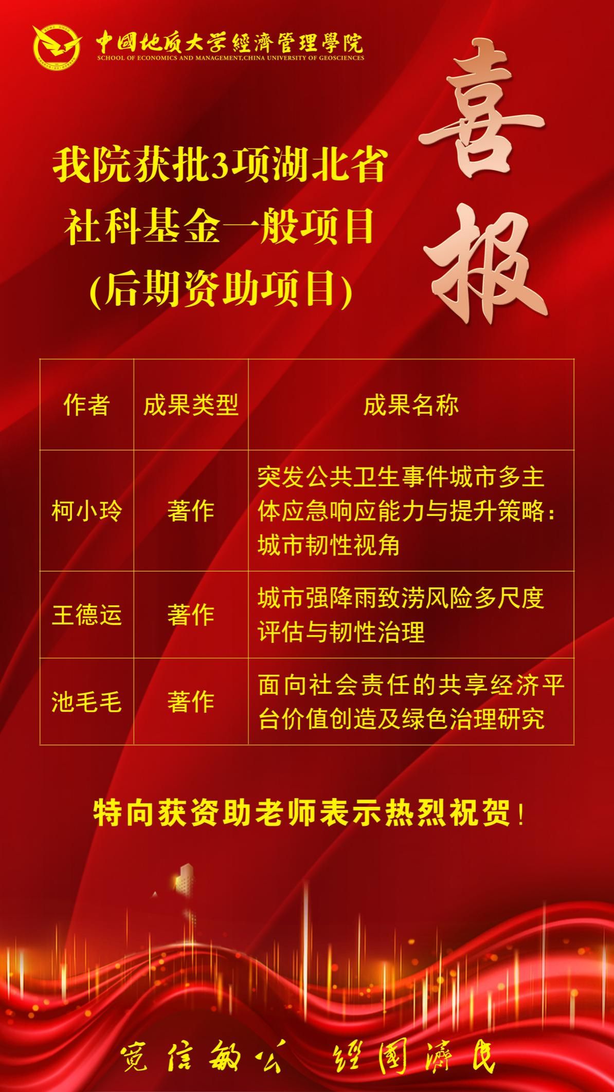 (通讯员 胡松琴)11月14日,2023年度湖北省社科基金一般项目(后期资助项目)拟立项名单公布,太阳成集团tyc122cc入口柯小玲、王德运、池毛毛三位老师申报的课题项目成功立项,我院科研成果再次喜获丰收。