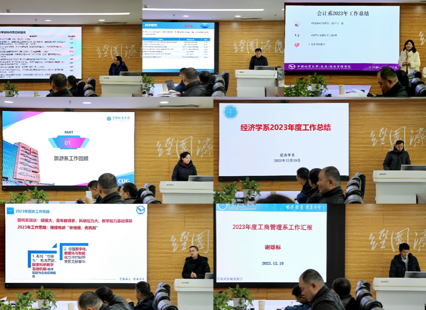 会上,统计学系、金融与贸易系、会计系、旅游管理系、经济学系、管理科学与工程系、工商管理系系主任分别从党建工作、教学、科研、人才引进、专业与学科建设等方面工作进展进行详细汇报,并分析了自身存在的问题和下一步工作思路。随后,学院综合事务办公室、研究生教育办公室、本科生教育办公室、德育工作组、专硕教育中心和实验教学中心科室负责人从2023年度目标工作责任完成情况、工作不足之处以及未来展望等方面作了工作汇报。