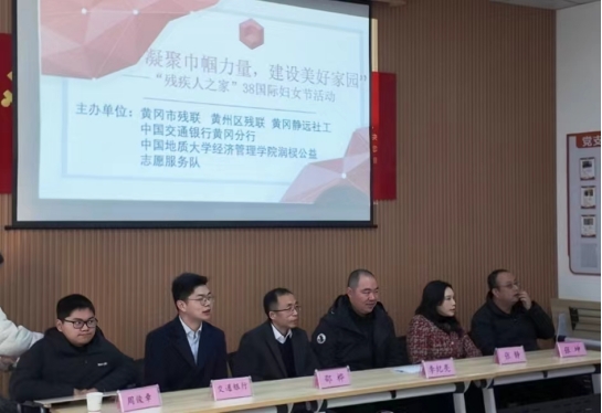 上午,学院师生到访黄冈市静远社区“残疾人之家”,与黄冈市残联、黄冈市黄州区残联、交通银行黄冈分行和静远社工中心等相关单位共同参加了“凝聚巾帼力量,建设美好家园”三八国际劳动妇女节表彰慰问活动,并座谈交流。活动中,我院党委副书记李纪亮代表地大经管学院师生向在场的女士送去节日的祝福,向受到表彰的残疾人士表示祝贺,表达了对残疾人士们的敬意。同时,他向长期关注和关心支持我院黄冈籍残疾学生周俊章的有关部门表示感谢,汇报了周俊章的在校学习生活情况,介绍了学校学院对他和他的家庭极特殊情况给予的帮扶及培养举措。