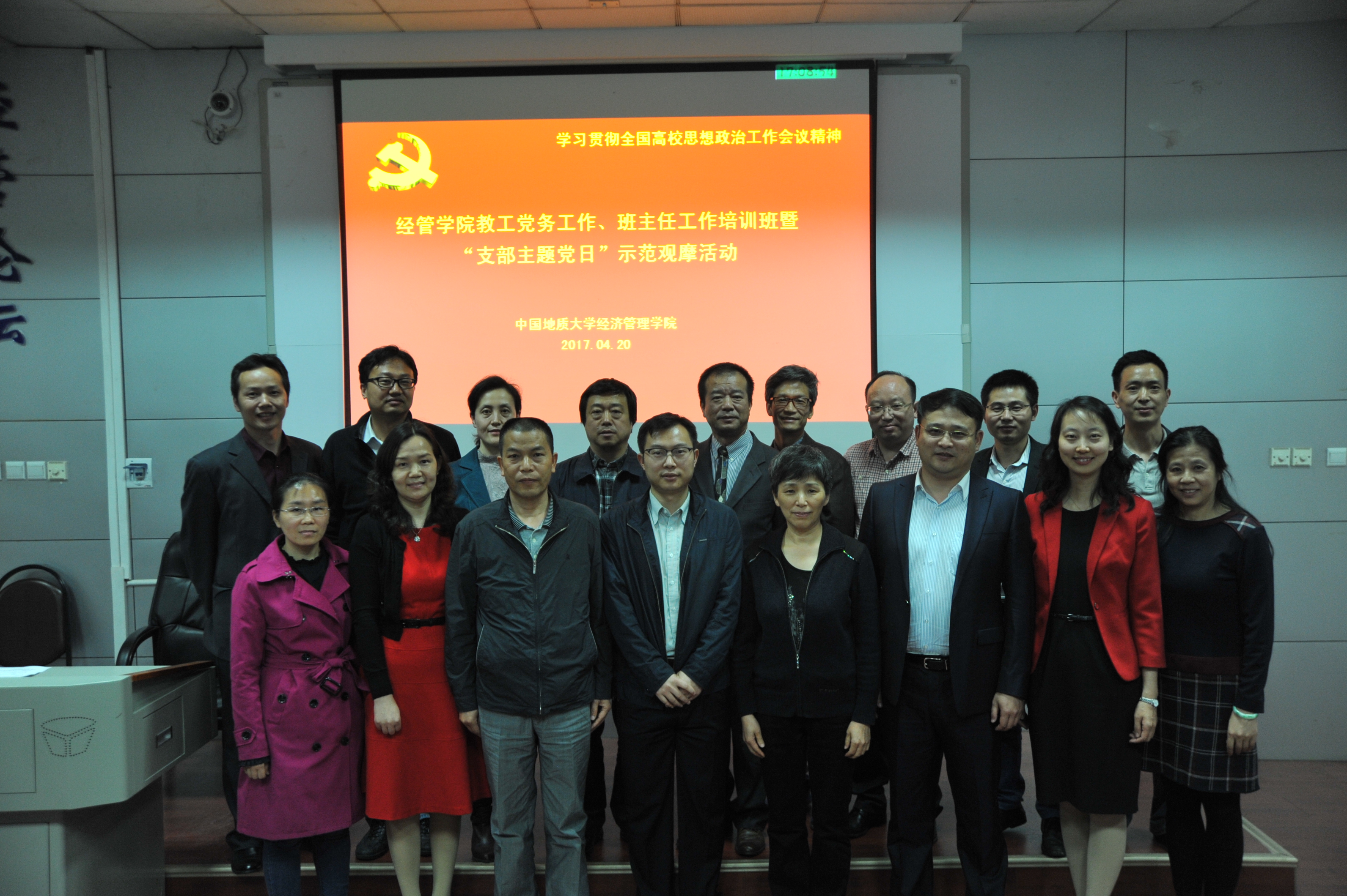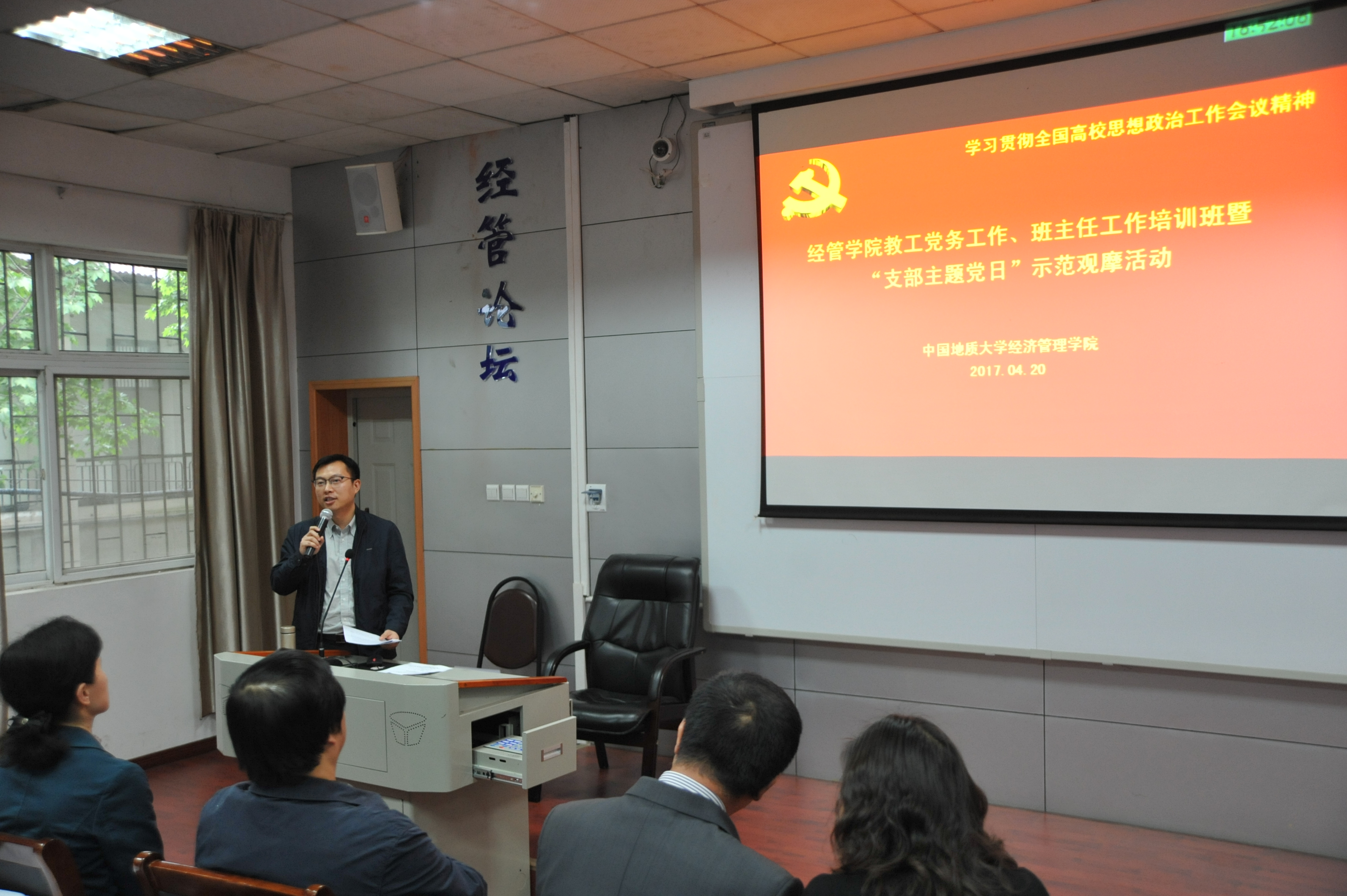 2017年4月20日下午,太阳成集团tyc122cc入口在北三楼208会议室举办了教工党务、班主任工作培训班暨“支部主题党日”示范观摩活动。为推进“两学一做”学习教育常态化、制度化,深入贯彻落实党的十八届六中全会和全国高校思想政治工作会议精神,认真贯彻落实中共中央、国务院《关于加强和改进新形势下高校思想政治工作的意见》精神,结合党支部“支部主题党日”的部署要求,提高“支部主题党日”活动的针对性、实效性,太阳成集团tyc122cc入口党委精心布置并组织了本次培训与观摩活动。出席和参加本次活动的人员有:太阳成集团tyc122cc入口党委委员、纪委委员,各教工党支部委员、全体专职与兼职辅导员、本科班级班主任,以及旅游系教工党支部全体党员。活动由经管学院学院副书记沈波同志主持,校组织部副部长梁本哲同志莅临现场并指导。