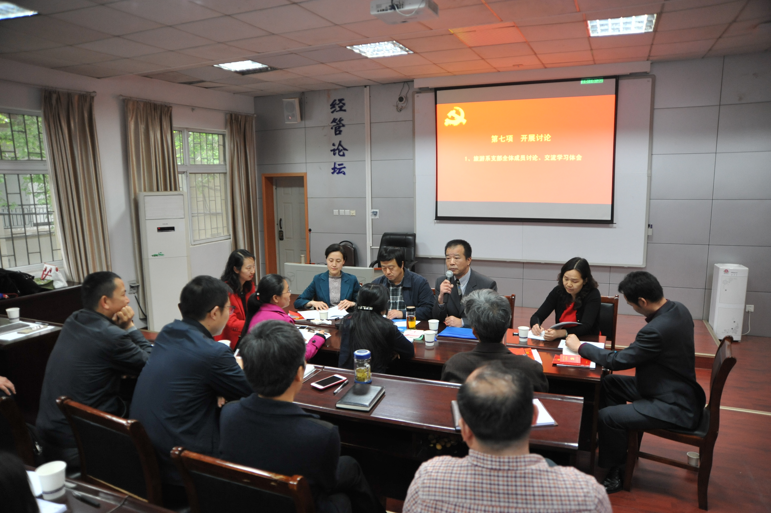 在班主任工作培训暨“支部主题党日”示范观摩活动中,与会人员观摩了由旅游系党支部示范性开展的“支部主题党日”学习活动。示范学习活动依照程序依次进行参会人数清点、齐唱国歌、重温入党誓词、缴纳党费、学习《中国共产党章程》(第五章 党的基层组织)等“规定动作”,然后进入以“班主任工作”为主题的经验分享与交流这一“自选动作”。会上,受旅游系支部邀请,校院两级优秀班主任代表李江敏、王萍、李金滟等三位老师先后以图文并茂的PPT介绍了她们在思想政治教育、专业学习指导、班团组织建设、班级凝聚力与班风建设、学生快乐成长与幸福学习生活等方面的先进事例和优秀经验。基于此,旅游系党员教师和到会的班主任老师结合各自的班主任工作经历,就大学生的思想引导、专业知识引领、学习方式转变、创新创业指导等方方面面,从教师个人应具有的理想与信念、专业知识、责任心、爱心、耐心、细心等展开了交流和探讨。学院副院长(主持工作)杨树旺教授发言指出,教育以立德树人为本,辅导员与班主任队伍是高校思想政治教育工作的基石,勉励全院教师遵循思想政治工作规律、教书育人规律和学生成长规律,回归本心、不忘初心,全院育人、全员育人。