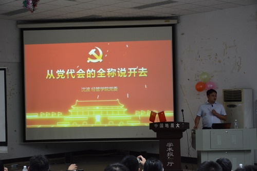 颁奖结束后,由党委副书记沈波同志主持,为全体本科生党员示范“主题党日”,完成规定动作:齐唱国歌、重温入党誓词、学习党章、缴纳党费,以及自选动作《从党代会的全称说开去》党课学习。沈书记从十八大、十八届六中全会的名称说开,分析中国共产党与其他国家政党的区别及优势所在,深入浅出地帮助学生党员牢固树立“四个自信”。