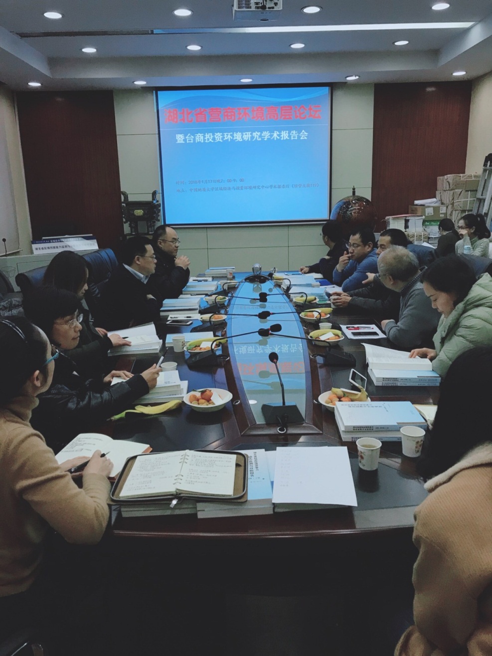 (通讯员吴磊、谢伟伟)2018年1月17日,“湖北省营商环境高层论坛暨台商投资环境研究学术报告会”在太阳成集团tyc122cc入口(武汉)区域经济与投资环境研究中心学术报告厅举行。湖北省台办王光斌处长、朱琨科长,经管学院杨树旺副院长、区域经济与投资环境研究中心邓宏兵教授,以及相关研究领域的专家、师生代表共计30余人参加了会议。邓宏兵教授主持了会议。