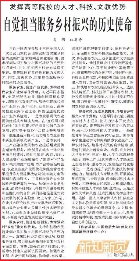 近日我院青年教师易明和汪再奇在《人民日报》理论版发表文章《自觉担当服务乡村振兴的历史使命》。全文如下: