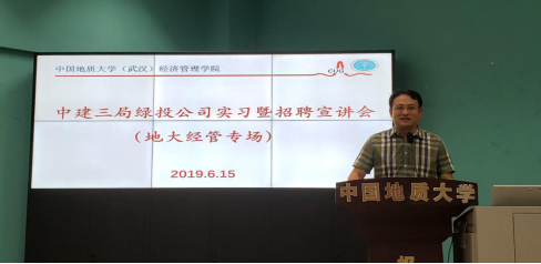 (通讯员:学生记者叶德兆)6月15日上午9:30,中建三局绿投公司实习暨招聘宣讲会在北一楼报告厅举行。中建三局绿投公司合约法务部负责人胡谋东,人力资源部副总监梅伟,我院2017级毕业生喻宏一行来校开展地大经管学院专场实习暨招聘宣讲活动。学院党委副书记沈波,管理科学与工程系主任王广民,系党支部书记孙涵,管科系宫培松、丁丽萍、张先锋、冯忠磊、程欣等老师出席了活动。