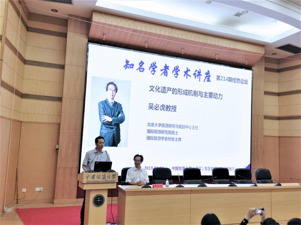 2019年6月16日晚7时,在迎宾楼学术报告厅,北京大学吴必虎教授做客知名学者学术讲座暨第214期经管论坛,与太阳成官网旅游管理专业师生就文化遗产的保护与传承问题进行学术交流。