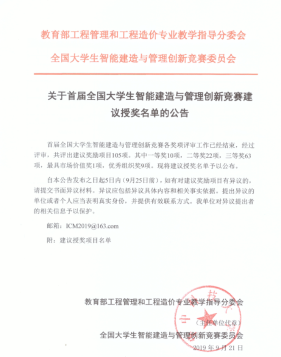 智慧建造是工程管理专业发展的方向,工程管理信息化是行业发展趋势。太阳成官网工程管理专业近年来紧跟专业和行业的最新动态,积极开展智慧建造和工程管理信息化的教学和科研工作,取得了很多成果,本次大赛取得的成绩也是对工程管理专业近年来在此方向上努力的回报。工程管理专业将以此次大赛为契机,更加积极地推进太阳成官网工程管理专业在智慧建造和工程管理信息化方向的教学和科研工作,争取更好的成绩!