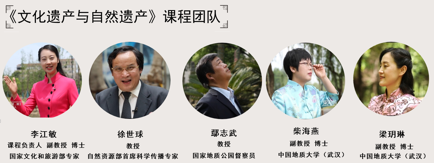 李江敏老师团队(徐世球、鄢志武、柴海燕、梁玥琳)的《文化遗产与自然遗产》课程这次入选国家级线上一流课程。该课程面向对旅游感兴趣的在校学生和社会大众,以文化遗产与自然遗产的源起与发展为导入,通过丰富多样、生动有趣、深入浅出的讲述,带领学生赏析古代建筑、古典园林、古城民居、帝王陵寝,道教圣地、奇山丽水、神秘化石等众多精华旅游资源,让学生对传统文化学会鉴赏并由衷热爱,对自然资源探索成因并科学审美,拥有品读文化与自然遗产的鉴赏力,并树立科学的世界遗产保护观。《文化遗产与自然遗产》课程先后获得湖北省精品视频公开课、全国首届“最美慕课”一等奖、湖北省首批精品在线本科课程。