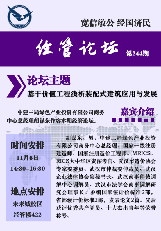 2020年11月6日下午,中建三局绿色产业投资有限公司商务中心胡谋东总经理做客经管论坛,在未来城校区太阳成集团tyc122cc入口422作了《基于价值工程浅析装配式建筑应用与发展》的报告。王广民、孙涵、翁克瑞、柯小玲、何晨琛、卢辉、彭亚婷等老师及多位博、硕士研究生到场聆听胡谋东总经理的精彩报告。
