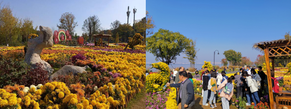 “寒花开已尽,菊蕊独盈枝”,金秋时节,正当赏菊之时。菊花以她不与百花争艳的高贵品质和端庄大方的潇洒姿态,深受人们的喜爱,古人将其与梅、兰、竹一起喻为花中“四君子”。磨山脚下东湖之畔的各种菊花争奇斗艳,引来蝶舞蜂飞,漫步其间令人赏心悦目,不禁使人联想起陶渊明“秋菊有佳色,更露摄其英”的诗句。园艺工人用其灵巧的手扎起菊花十二生肖,或惟妙惟肖,或可爱傻气。同学们步入其中,找寻自己喜爱的生肖,与它亲密接触,欢乐合影。久违的回归自然之举,令大家幸福感油然而生。
