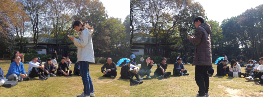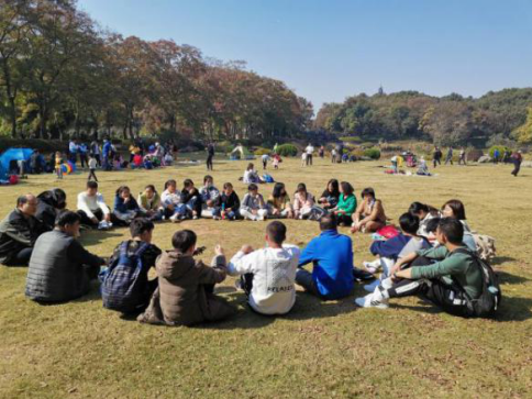 在磨山公园,师生们在草地上席地围圈而坐,进行亲密的交流。首先,活动组织者、班主任王林珠老师为了增进师生之间的相互了解,让同学们进行了自我介绍,随后,统计学系党支部书记王德运老师为同学们介绍了统计学系近年来取得的成绩,增强了同学们的专业自信。