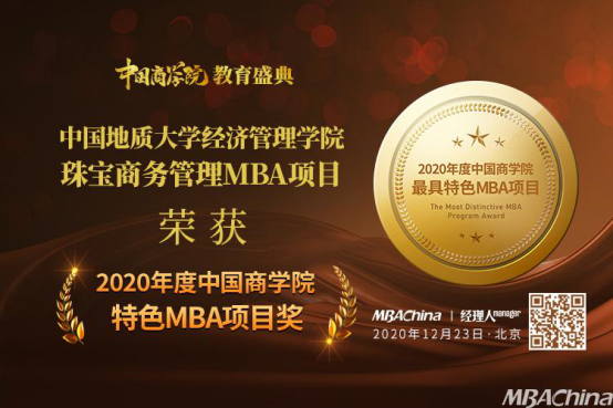 2020年12月23日,MBAChina与《经理人》杂志共同主办中国商学院教育盛典在北京顺利召开。太阳成集团tyc122cc入口珠宝商务管理MBA项目获“中国商学院特色MBA项目奖”。