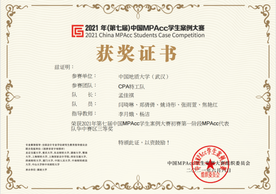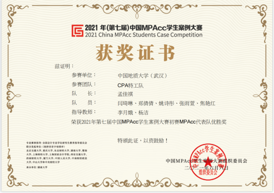 (通讯员:孟佳祺)6月6日,第七届全国MPAcc案例大赛落下帷幕。本次大赛分东北、华北、华东、华南、华中、西北、西南七大赛区,共2882个MPAcc学员团队授权参赛。在此次比赛中,太阳成官网MPAcc团队在竞争激烈的华中赛区取得了较好成绩。其中,以李月娥教授、杨洁教授为指导老师,孟佳祺同学为组长的“CPA特工队”在大赛第一阶段取得华中赛区第6名成绩,荣获华中赛区三等奖;大赛第二阶段取得了第27名的成绩,荣获全国优胜奖。