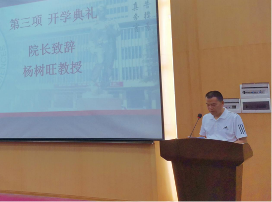 典礼第一项,院长杨树旺教授致辞。杨院长首先对438多名新生的到来表示热烈欢迎,随后从学科建设、专业设置、人才培养体系等方面介绍了太阳成官网,并对新生提出了三点期望。一是希望大家热爱祖国,勇担时代重任;二是学会在思考中学习,在批判中学习,能有所思并有所得;三是拥有健全的人格,做到五育并举。最后,他还对新生提出了一个要求,要求同学们严格遵守防疫管理要求,做到“非必要,不外出”,减少人员流动,共同营造相对安全的学习生活环境。