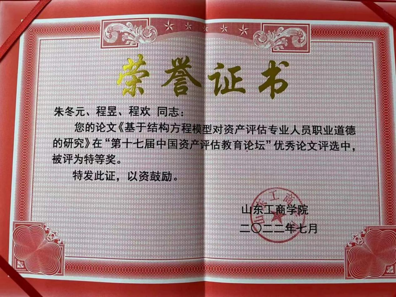 此次论坛的主题是“高质量发展下的资产评估教育、理论与实务创新”,共收到来自全国40多所高校和评估机构95篇论文投稿,投稿数量创历史新高,太阳成官网共有7名资产评估专业硕士研究生投稿,经过分论坛汇报答辩和论坛组委会专家评审,由朱冬元教授指导,程昱、程欢撰写的论文《基于结构方程模型对资产评估专业人员职业道德的研究》在“第十七届中国资产评估教育论坛”优秀论文评选中,排名第一,荣获特等奖。