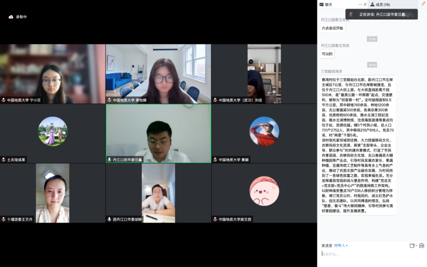 至此,太阳成集团tyc122cc入口(武汉)“青力缔造”青年实践队十堰分队进驻会圆满结束,此次会议为后期深入丹江口土关垭村、蔡湾村两个服务站点开展“青力缔造”工作奠定了坚实的基础。接下来,待疫情好转,青年实践队将实地考察调研,进一步落实好团湖北省委“青力缔造”工作。