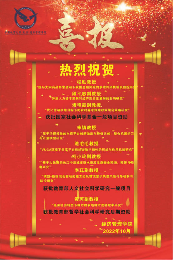 教育部社科司公布了2022年度教育部人文社会科学研究一般项目及教育部哲学社会科学研究后期资助立项结果,我院共获批5个项目,其中4项获人文社科项目资助,1项获哲学社会科学研究后期资助。