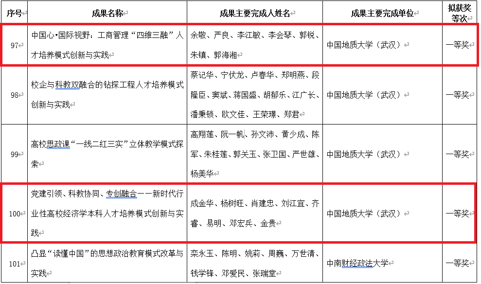 近期,经过第九届湖北省高等学校教学成果奖评审委员会的严格评审和为期一个月的结果公示,我院由余敬教授主持的《中国心•国际视野:工商管理“四维三融”人才培养模式创新与实践》和由成金华教授主持的《党建引领、科教协同、专创融合——新时代行业性高校经济学本科人才培养模式创新与实践》两个项目分别荣获湖北省高等学校教学成果一等奖。