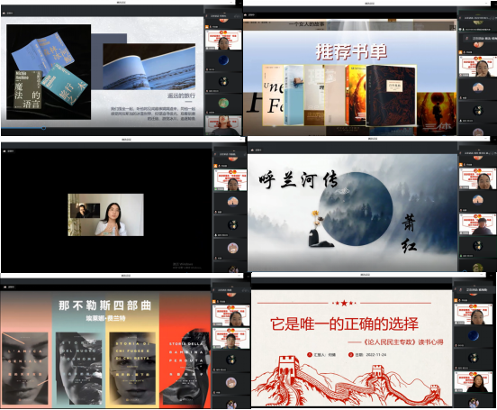 在何倩同学分享了《论人民民主专政》解读后,刘晶晶老师说:“读史明智,读书也能够让我们明理。在人民民主专政这个制度前提下,我们国家的发展愿景中有人民,发展战略中有人民,战略的实施举措中更是有人民。在国内疫情反复和目前复杂的世界形势之下,我们既要怀着高度的民族自信和制度自信,全身心投入到生活、工作和学习中,更要在阅读中逐渐培养独立见解和批判精神,辩证、独立思考,甄别各类信息。”