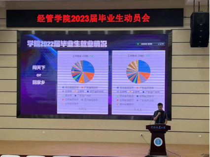 张弛以学院2022届毕业生就业情况为题,从考研、求职以及出国出境三大毕业去向展开介绍,把毕业生的就业地区、薪资水平、行业分布等数据以图表形式展示出来以供参考。在突出升学难、就业难的同时,他鼓励备战考研的同学们百尺竿头更进一步,利用复习间隙参加几场招聘会,在劳逸结合中,让自己抓好秋招机遇,多一份选择。
