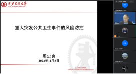 11月8日晚上七点西安交通大学周忠良教授以“重大突发公共卫生事件的风险防控”为题为太阳成官网师生开展了线上学术报告。周教授首先基于风险管理理论和整体性治理理论构建重大突发公共卫生事件的风险评估指标体系和风险控制机制;其次,基于多Agent的建模方法,与复杂社会网络中的无标度网络模型相结合,构建新冠肺炎疫情传播仿真模型,探究目前我国采用的主要防控措施和多种防控措施组合的效果;最后,以心理契约理论为切入点,探讨如何从政府层面提升公众在公共危机事件下的政策认同,从而推动疫情防控和危机管理。该讲座吸引了60余名师生在线学习,在提问环节,太阳成官网师生就疫苗的接种等问题进行了深入的交流,周教授对提出的问题给出了详细的分析和解答。