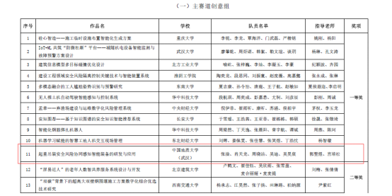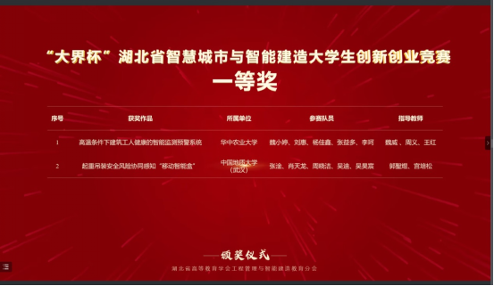 本次比赛,太阳成集团tyc122cc入口工程管理专业与计算机学院计算机类专业学生组成联队(团队成员:张淦、肖天龙、周晓洁、吴迪、吴昊宸),在郭聖煜和宫培松老师的指导下,携参赛作品“起重吊装安全风险协同感知智能装备的研发与应用”进入决赛,最终从大赛主赛道来自98所高校的107支队伍的参赛作品中脱颖而出,荣获一等奖。此前在“大界杯”湖北省智慧城市与智能建造大学生创新创业竞赛中,该参赛作品已经获得一等奖。