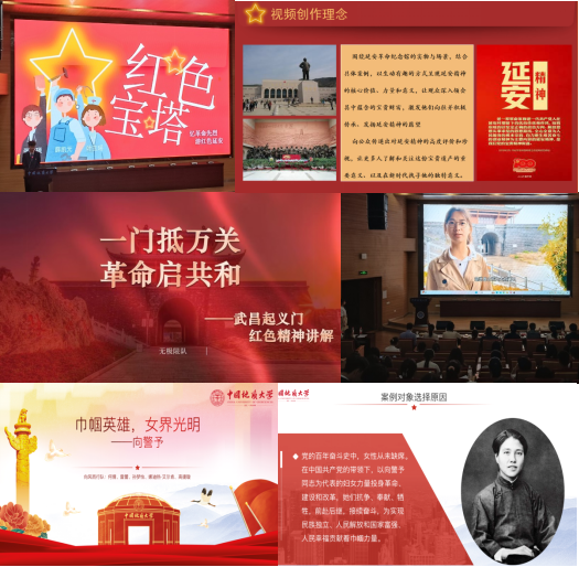 三个赛道的七组选手进行了精彩的展示。在“红色足迹,壮丽华章”赛道,三个进入决赛的队伍先后展示了他们制作的红色精神微讲解视频作品并陈述其创作理念。其中,“红色宝塔”队的作品《忆革命先烈,游红色延安》,以延安革命纪念馆为载体、以“延安精神”为核心,讲述了老一辈革命家和共产党人在延安时期留下的优良传统和作风。“无极限”队的作品《一门抵万关,革命启共和》围绕武昌起义门展开,从首义精神入手,回顾武昌首义过程,讲述革命先烈熊秉坤等人首发第一枪的英雄故事,提倡同学们学习他们可贵的精神品质。“向风而行”队的作品《巾帼英雄,女界光明》,通过向警予故居、向警予生平纪念馆与烈士园林等地的解说,向大家展示和讲解了中国共产党“唯一的一个女创始人”、中国妇女运动先驱和领袖向警予的革命生涯和红色故事,介绍她在领导中国革命、为新中国成立和妇女解放做出的巨大贡献,激励新时代青年积极寻访红色景点,传承红色基因,坚定红色信念。