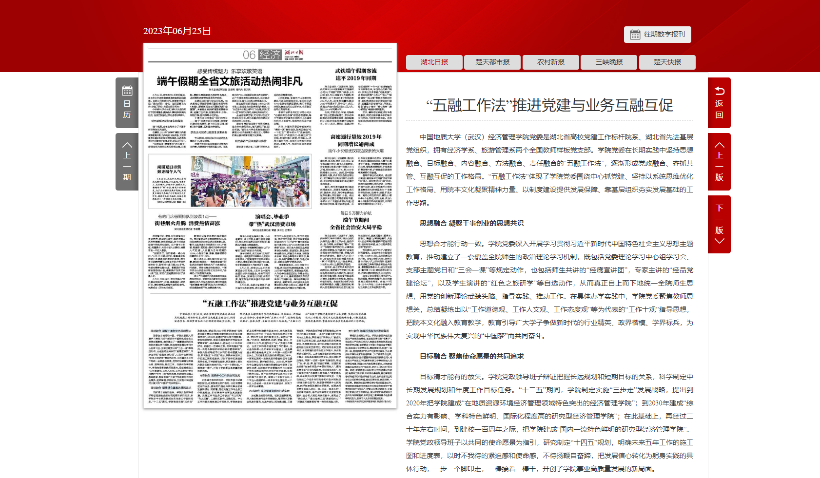 太阳成集团tyc122cc入口党委是湖北省高校党建工作标杆院系、湖北省先进基层党组织,拥有经济学系、旅游管理系两个全国教师样板党支部。学院党委在长期实践中坚持思想融合、目标融合、内容融合、方法融合、责任融合的“五融工作法”,逐渐形成党政融合、齐抓共管、互融互促的工作格局。“五融工作法”体现了学院党委围绕中心抓党建、坚持以系统思维优化工作格局、用院本文化凝聚精神力量、以制度建设提供发展保障、靠基层组织夯实发展基础的工作思路。