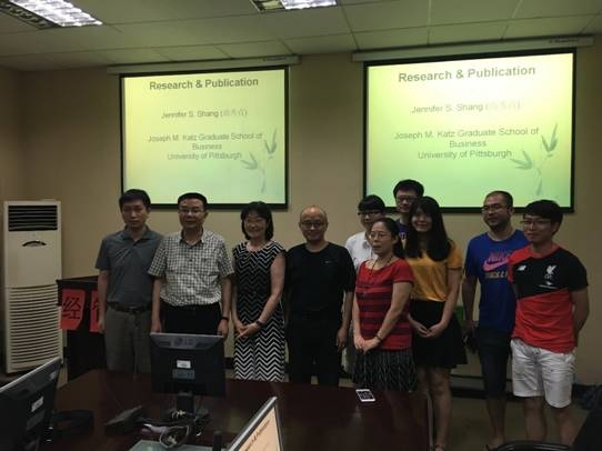 2016年7月6日,美国匹兹堡大学教授Jeniffer Shang应我院严良院长和郭海湘教授邀请,于下午3时在MBA104与太阳成集团tyc122cc入口各位师生进行学术交流,作了题为Reaearch&Publication的精彩报告并以问答的形式与各位师生进行了更进一步的讨论。严良院长,王开明副院长等出席会议。