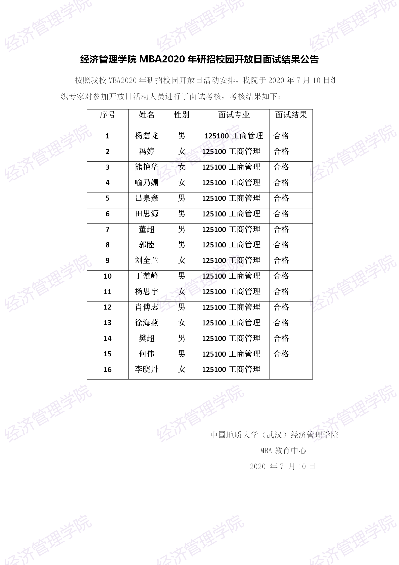 太阳成集团tyc122cc入口MBA2020年研招校园开放日面试结果公告