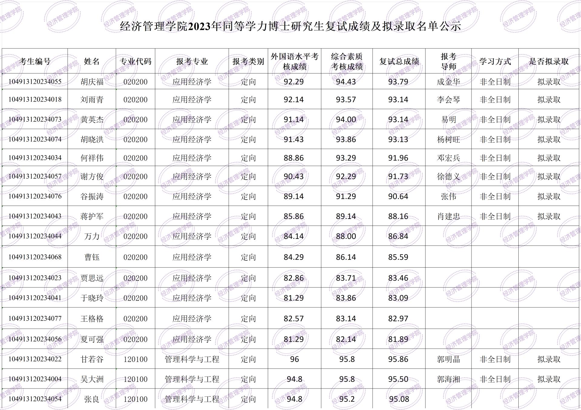 根据2023年同等学力人员申请博士学位研究生招生复试录取工作方案,经资格审查和复试考核,现对2023年拟录取单证博士生名单予以公示,公示期为6月12日-6月21日。在公示期内有异议的,请联系经管学院研究生办公室王老师,联系方式:027-67883204,邮箱:360655881@qq.com。