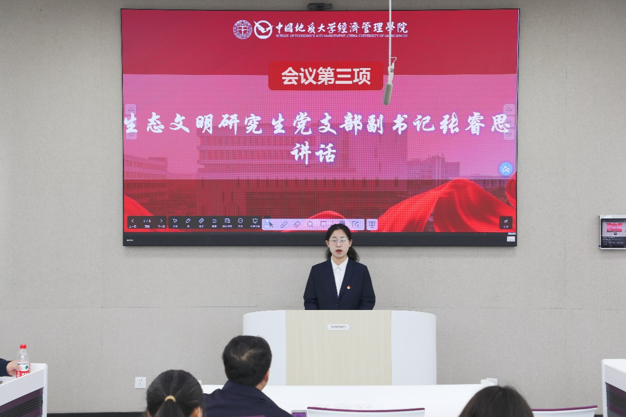 生态文明研究生党支部副书记张睿思表示,作为学校的首批研究生样板党支部,将会以习近平新时代中国特色社会主义思想和党的二十大精神为指导,深学笃行习近平生态文明思想,坚持文化为魂、科研为本、服务为要的建设思路,积极探索“党建+文化传承”“党建+科研实践”“党建+服务大局”三位一体的党支部发展模式,从不同维度最大限度地发挥党建引领作用,全力打造“党建红”领航“生态绿”的党建品牌,支部将全力抓住学院党委入选全国党建工作标杆院系培育创建单位的契机,努力做好支部发展,为标杆院系验收添砖加瓦,为学院党委创新建设和学院高质量发展贡献青春力量!