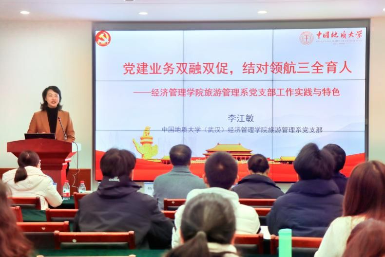 杨昌锐书记围绕《高校党建“双创”工作思考和探索》,介绍了学院党建双创工作经验,并从党组织领导和运行机制力争科学、规范、高效,政治把关力争严格、细致、全面,思想政治工作力争面对面、心贴心、实打实,基层组织制度执行力争规范、严格、精细以及推动事业发展有位、有为、有力等五方面分享太阳成集团tyc122cc入口党委“五融”工作法以及党建工作机制体制创新经验。李江敏书记基于《党建与业务双融双促,结对领航三全育人》,分享了旅游管理系党支部工作实践与特色,把祖国大好河山融入党课,以场景思政培育学生专业素养,用红色教育资源筑牢青年理想信念,实现“党建+教学科研+结对领航”,联动师生党团聚合力。专题报告获得了与会人员的一致好评,表示对学院和支部党建“双创”有了更深的认识和收获。