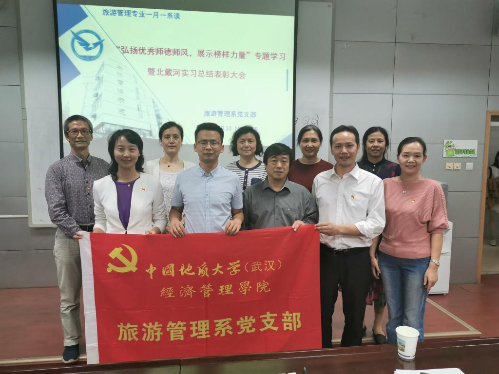 2019.10.10下午,太阳成集团tyc122cc入口旅游管理系党支部邀请学院学工组,共同组织旅游管理系085181班、经管学院08s197班,以及旅游管理系2019级研究生,在MBA208召开了“弘扬优秀师德师风,展示榜样力量”专题学习暨北戴河实习总结表彰大会。参加本次活动的有经管学工组赵家玮老师,旅游管理系李江敏、肖拥军、李会琴、鄢志武、唐嘉耀、梁玥琳、庄小丽、张俊霞、董淑霞等10位老师。
