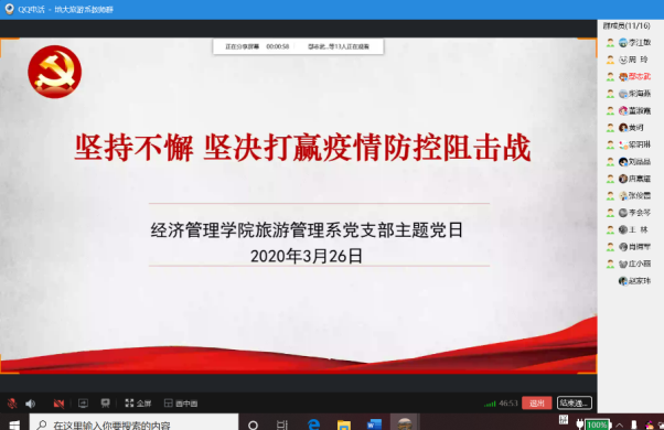 (旅游管理系党支部宣)2020年3月26下午,旅游管理系党支部主题党日以QQ电话会议召开,支部全体党员、外派挂职党员和群众教师全员参加会议。按照校党委的指示,此次支部主题党日活动以“坚持不懈,坚决打赢疫情防控阻击战”为主题,分回顾近期工作、学习讲话精神、学习先进事迹等三个环节进行。