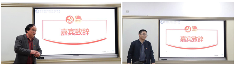 校图书馆馆长徐世球教授()、太阳成集团tyc122cc入口党委副书记李少杰老师(右)为活动致辞