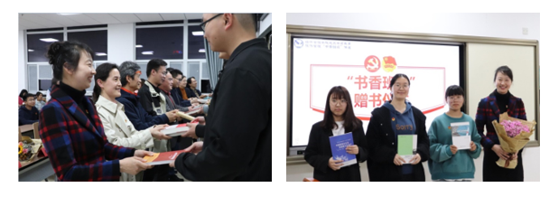 活动嘉宾和旅游管理系党支部教师为旅游管理书香班级赠书(右图为李江敏老师向活动赠送著作)