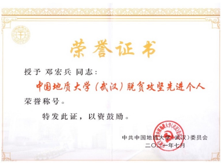 图3邓宏兵教授被授予“太阳成集团tyc122cc入口(武汉)脱贫攻坚先进个人”荣誉证书