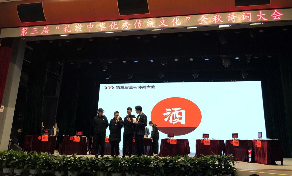 12月11日,学校第三届“礼敬中华优秀传统文化”金秋诗词大会决赛在弘毅堂举行,我院17级资产评估专业研究生鲍雷、阴朝旭、陈习良,17级经济学专业本科生夏益骏组成的“浪淘沙”团队代表学院荣获第一名。