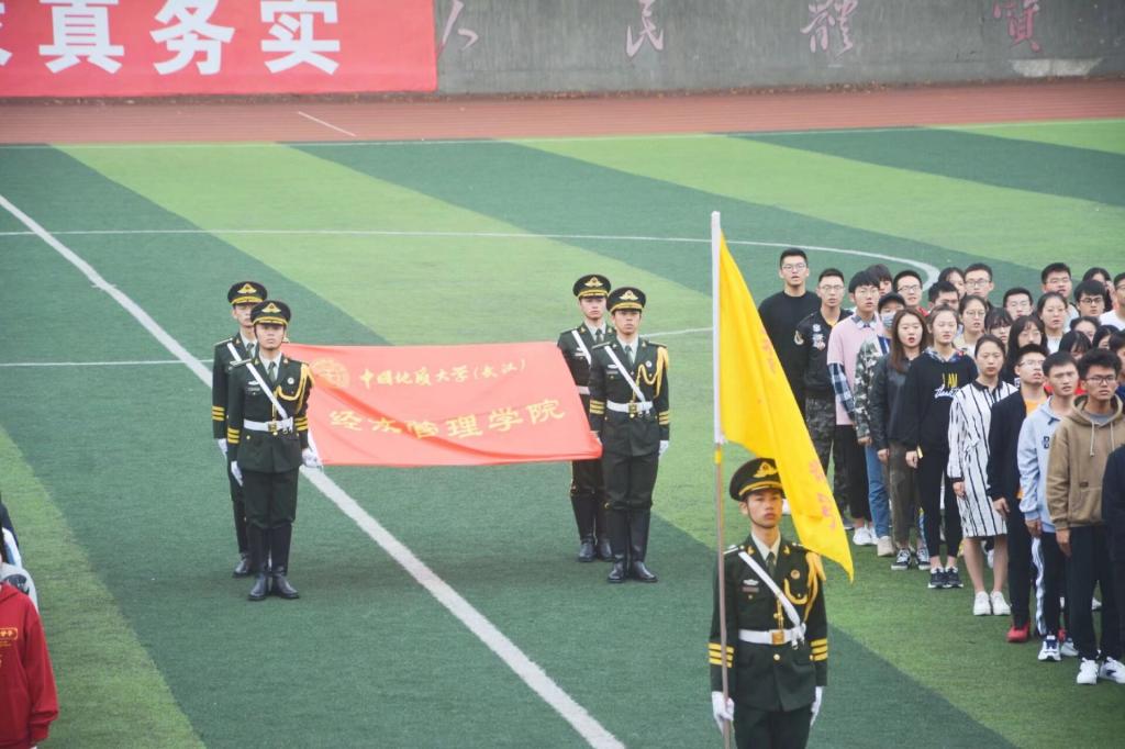 学院本研学生与全体教职工共编为五个联队,迈着整齐的步伐依次入场。工商A联队由学院工商管理大类08S191、08S192、08S193、08S193班新生和工商管理专业、市场营销专业高年级本科生及两个专业的教职工组成;工商B联队由工商管理大类08S195、08S196、08S197班新生和会计学、旅游管理专业高年级本科生及两个专业的教职工组成;经济统计联队由经济大类08J191、08J192、08J193班,统计学088191班新生和经济学、国际经济与贸易、统计学专业高年级本科生及三个专业的教职工组成;管科联队有08G191、08G192、08G193、08G194班新生和信息管理与信息系统、工程管理专业高年级本科生及两个专业的教职工组成;研究生联队由全体研究生和院直行政教职工组成。