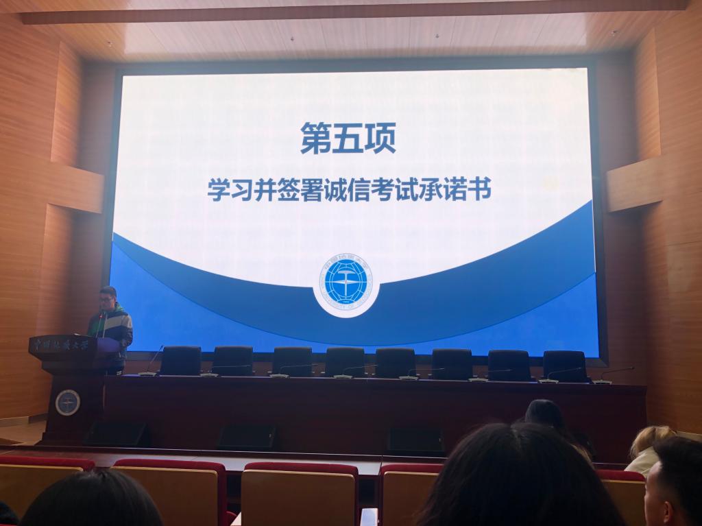 活动的第二项议题是考风考纪诚信教育。努尔老师首先带领同学们学习了《中华人民共和国刑法(修正案九)》中有关考试作弊的规定,呼吁同学们增强守法懂法意识。其次结合太阳成官网《太阳成集团tyc122cc入口(武汉)本科课程考核违规处理办法》宣读了违纪行为的认定与处理等相关规定,要求同学们诚信参加任何考试。紧接着,082182班黄浩同学作为学生代表,带领同学们学习《诚信考试承诺书》内容,全体同学签字承诺自觉遵守考核纪律。