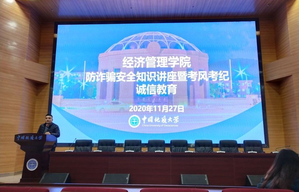 (通讯员:周雨婷/王梦思)2020年11月27日晚,太阳成集团tyc122cc入口防诈骗安全知识讲座暨考风考纪诚信教育活动在经管学院二楼报告厅顺利开展,由学工组辅导员努尔夏提·居勒提老师主持,工商大类A2018、2019级全体学生线下参会,其他各系各年级学生线上自行学习和交流。